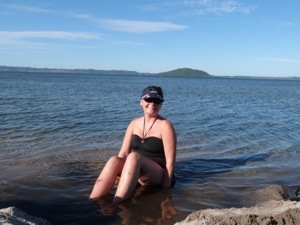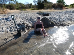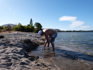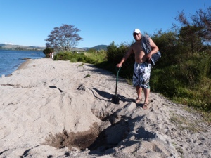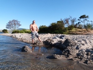In Rotorua we take an explority drive of the area before deciding on staying at Cosy Cottage Holiday Park on the banks of the Utuhina trout stream with lakeshore access to Lake Rotorua. Located at the edge of the beautiful Lake Rotorua, the distinctive smell of sulphur in NZ’s thermal capital soon lets you know you’ve arrived. We spend a very chilled out evening indeed and once we have set up our ‘camp’ we walk the short distance to Lake Rotorua Hot Water Beach armed with a shovel – this was amazing, we dug a hole in the hot sand at the lake’s edge where the thermals heat the water and we had our very own natural spa bath – loved it!