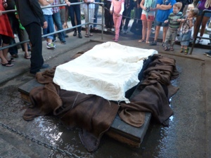 Amazingly, there is a huge crowd around this area just watching the antics that are going on and it's very enjoyable to witness. One huge guy just bombs from the platform and, much to the delight of the crowd, creates a great splash of water wetting everybody near the edge. Very funny!
