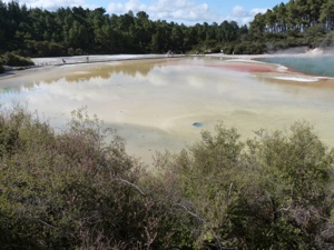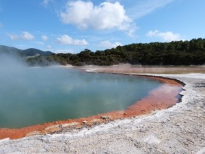 The Artist’s Palette – a panorama of hot and cold pools and steaming hissing fumeroles producing an amazing variety of ever-changing colours. Overflowing water from the Champagne Pool draws with it minerals that have originated from below the surface. To the left of the Palette is a geyser from which steam rises and water can erupt to a height of one metre.