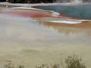 The Wai-O-Tau stream forms and integral part of the drainage system which ultimately flows into the Waikato River and out into the Tasman Sea. Boiling springs and volcanic gases introduce numerous minerals into the water. Beneath the ground there is a system of streams which are heated by magma left over from earlier eruptions. The water is so hot (temperatures of up to 300 degrees centigrade have been recorded) that it absorbs minerals out of the rocks through which it passes and transports them to the surface as steam where they are ultimately absorbed into the ground. This so called ‘rotten egg smell’ (and it doesn’t half honk!) of geothermal areas is associated with hydrogen sulphide. The wide range of colours in the area are all natural and are due to different mineral elements, the predominant colours being:-