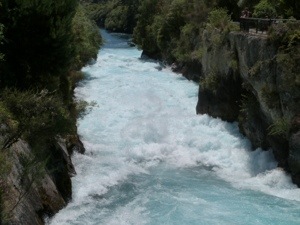 The incredible volume of water is due to the Waikato River, 100m wide and 4m deep upstream, being forced through the carved channel of the hard rock, which is only 15m wide and 10m deep. About 220,000 litres of water plunges over the rock face of Huka Falls every second, and could fill an Olympic swimming pool in 12 seconds!!!! The Waikato River is New Zealand’s longest river, its 425km journey starting at Lake Taupo and ending at the sea south of Auckland.