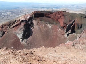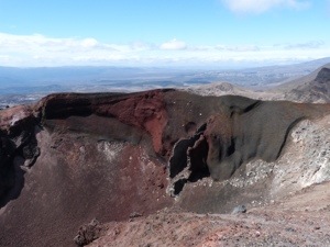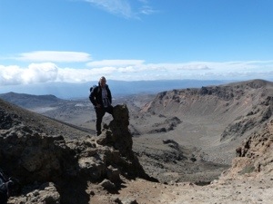 Once at the Red Crater there are spectacular views to the east over the Kaimanawa Forest Park and Desert Road. Looking into the crater, there is an unusual formation within known as a ‘dike’. This feature was formed as molten magma moved to the surface through a vertical channel in the crater wall. The red colour is from the high temperature oxidation of iron in the rock. It is from here that a side trip can be taken to the summit of Mt Tongariro, which Neil completes later in the day.