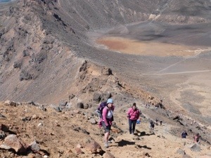 From the Mangatepopo Road Car Park @1100m we walk to the main track and continue at a gentle gradient alongside a stream and around the edges of old lava flows. The track climbs steadily to the South Crater @ 1700m and we are ‘in the clouds’ as we cross over two lava flows from eruptions in 1870 and on this now clear day there are magnificent views from this section of the track. It is here where, for those who want to, you can clim Mt Ngauguhoe (Mt Doom). We continue across the South Crater to a ridge leading up to Red Crater @1886m, a still active crater.