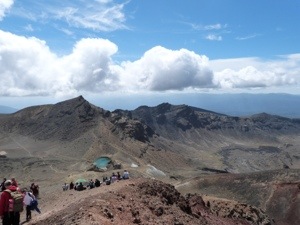 The summit of Red Crater is the highest point on the Tongariro Alpine Crossing. It is here that we sit on the loose scree of the steep incline and eat our lunch overlooking Emerald Lakes. Minerals leaching from the adjoining thermal area cause their brilliant colour. The Maori name is Ngarotopounamu meaning greenstone-hued lakes The lakes freeze in winter. Due to the recent volcanic activity, it is here that our crossing ends and return the way we came. If we were allowed to carry on, our walk would have skirted the Blue Lake – a cooled lava lake – but we do not miss out on this as we get a good view from where we are.