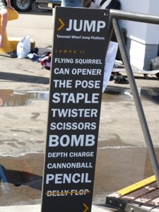 It is the museum which we are heading to and stop for an hour at the Taranaki Wharf Jump Platform, a series of platforms from which the public are jumping into the Wharf!