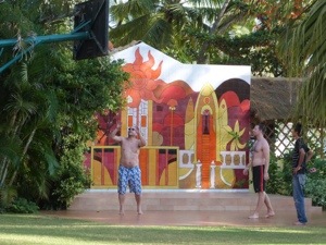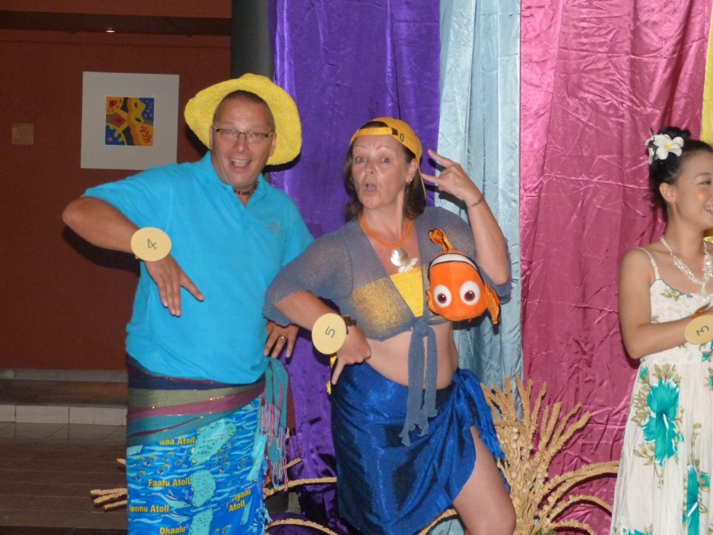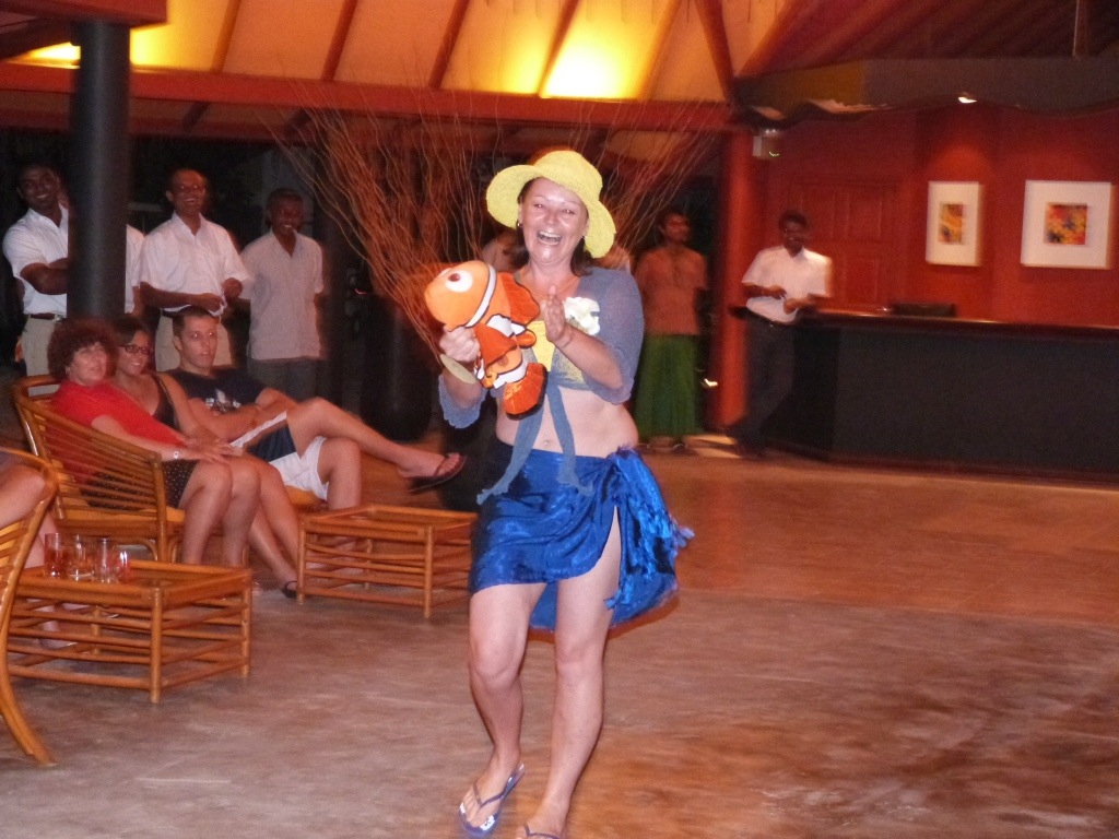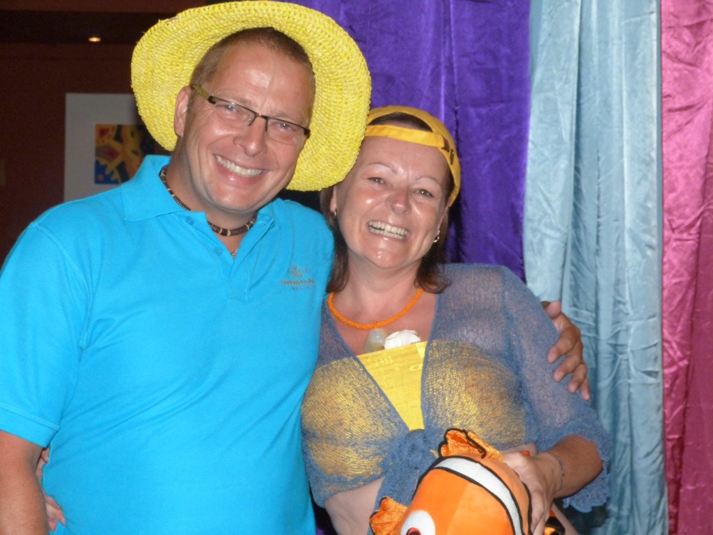 The bar is packed for the entertainment and Neil and I, along with other guests, proceed to change and prepare. Neil and I plan our routine – we are to walk up the catwalk, occasionally stopping to pose (yeh baby!), plant our hats on some poor person, pick them up and carry on to the final line up!!!!! Well, that’s the plan anyway and we ‘rehearse’ as much as we can in the short time we have. AND, in Theresa style that all goes out of the window when the music starts and its our turn … pmsl … an adrenalin rush takes over and I do my own thing, dragging my Nemo under my arm !!!!! I can’t even see where Neil is and the cheering just spurs me on; lol lol lol !!!!! Carina is in charge of the camera and is our official photographer – I’ll let the pics speak for themselves.
