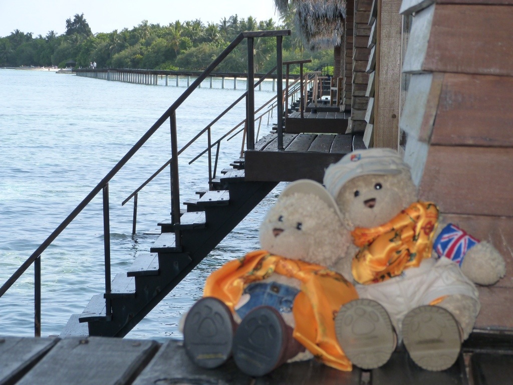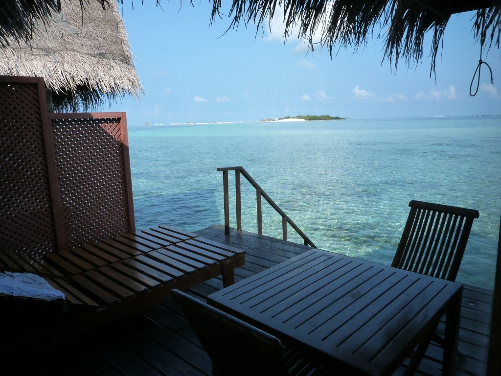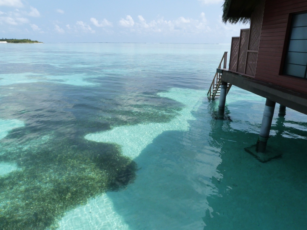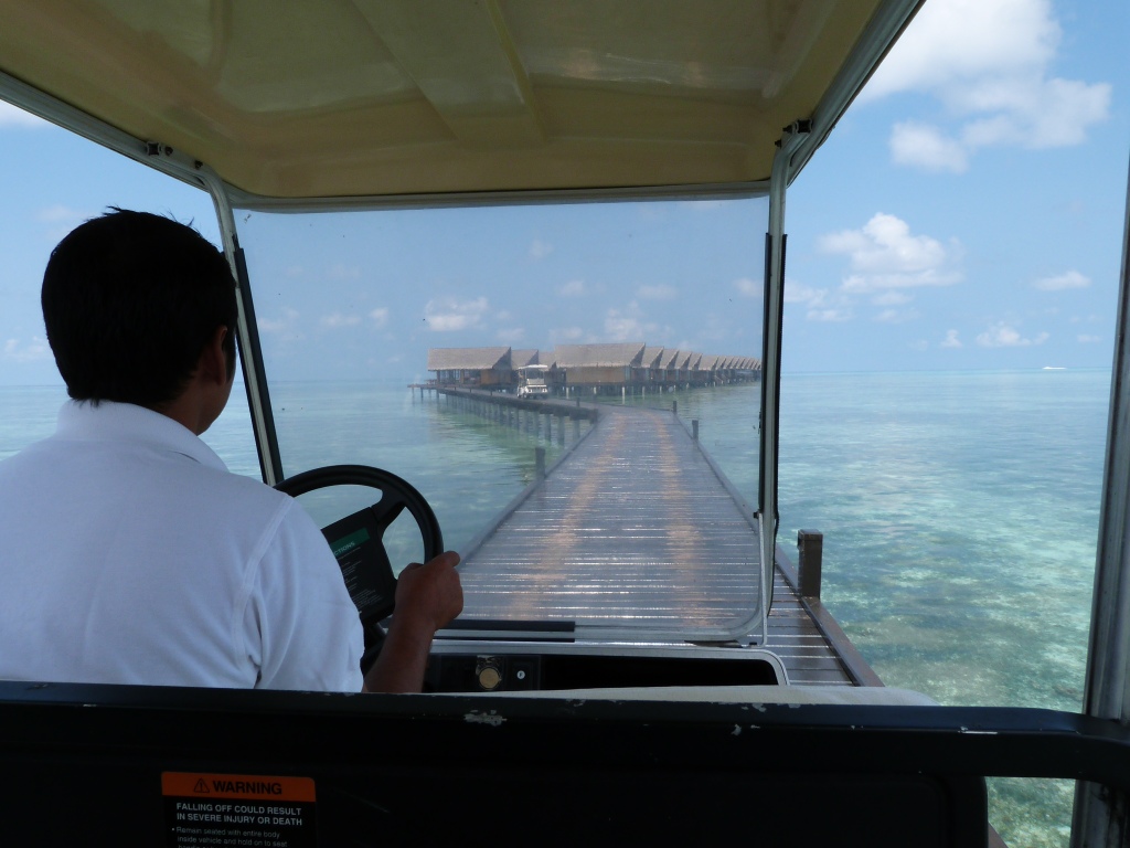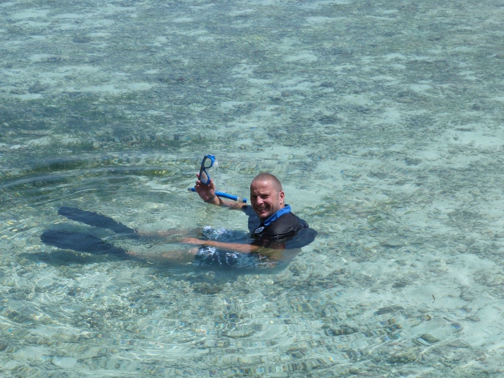 Our first three days are spent in the seclusion of the Ocean Villa, enjoying the ambiance of this place out on the water; from snorkelling off our deck to romantic dinners/breakfasts in the restaurants set aside exclusively for Ocean Villa guests. On our first morning, we decide to attempt our first snorkel experience by swimming over to the island; our objective was to swim over and back again and access the Villa up the steps to our deck!! However, on crossing we venture onto the island to explore. Before you know it, we enjoy an afternoon meeting other guests in the swimming pool bar!!!!! It’s so nice that the time flies and it’s not long before I am feeling the effects of the sun and need to head back. However, as we had snorkelled across from our Villa, we soon learn that we are unable to return that way as the tide has now gone out. After cutting ourselves on the coral in our attempt to do so, we shamefully wade backwards through the sea to the beach and return via the bridge a little worse for wear. We have learnt a big lesson today 😦 and can only laugh about it much later but, at the time it did not seem funny as we were burnt, cut, did untold damage to the coral (shamefully 😦 ) and had to ask the Butler to let us into the Villa.