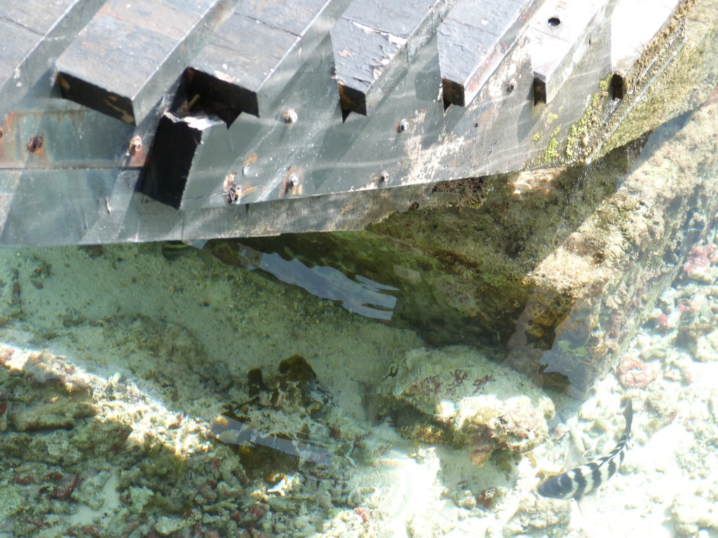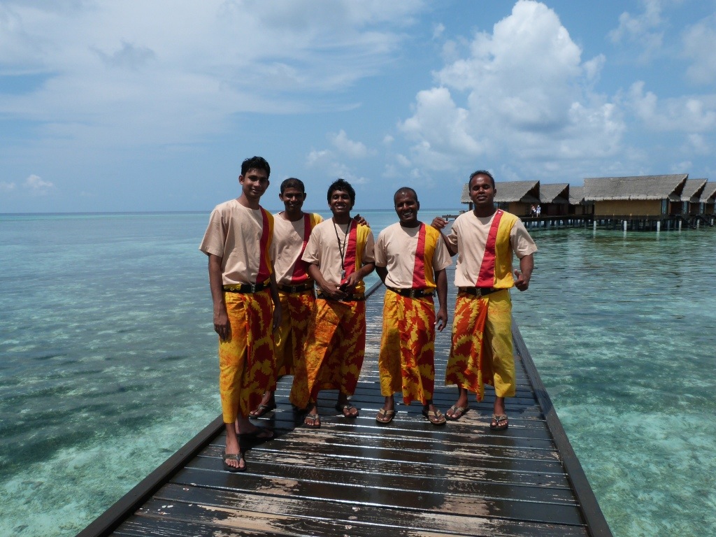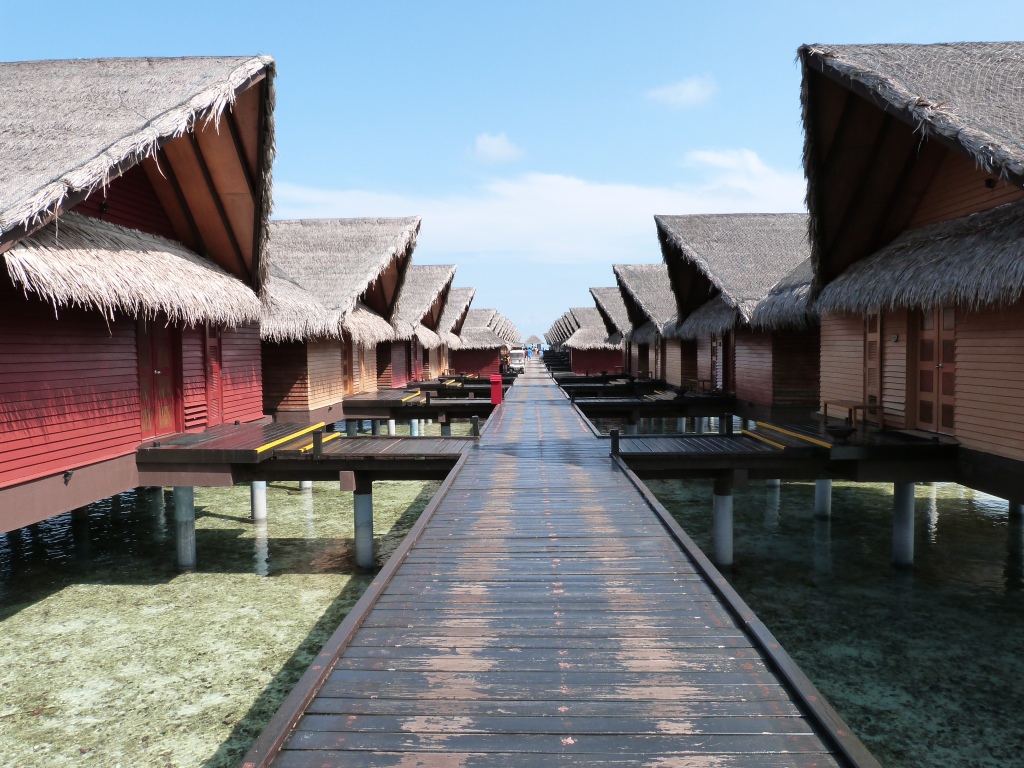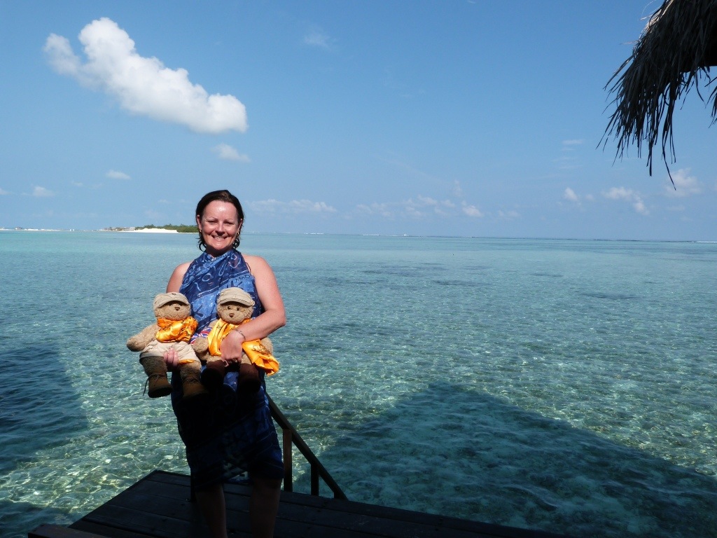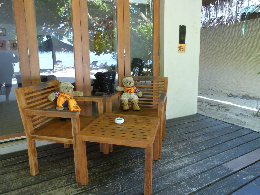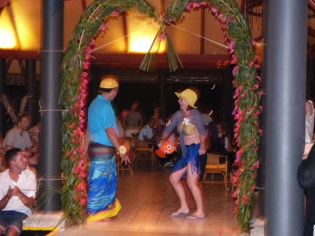 Our first three days are spent in the seclusion of the Ocean Villa, enjoying the ambiance of this place out on the water; from snorkelling off our deck to romantic dinners/breakfasts in the restaurants set aside exclusively for Ocean Villa guests. On our first morning, we decide to attempt our first snorkel experience by swimming over to the island; our objective was to swim over and back again and access the Villa up the steps to our deck!! However, on crossing we venture onto the island to explore. Before you know it, we enjoy an afternoon meeting other guests in the swimming pool bar!!!!! It’s so nice that the time flies and it’s not long before I am feeling the effects of the sun and need to head back. However, as we had snorkelled across from our Villa, we soon learn that we are unable to return that way as the tide has now gone out. After cutting ourselves on the coral in our attempt to do so, we shamefully wade backwards through the sea to the beach and return via the bridge a little worse for wear. We have learnt a big lesson today 😦 and can only laugh about it much later but, at the time it did not seem funny as we were burnt, cut, did untold damage to the coral (shamefully 😦 ) and had to ask the Butler to let us into the Villa.
