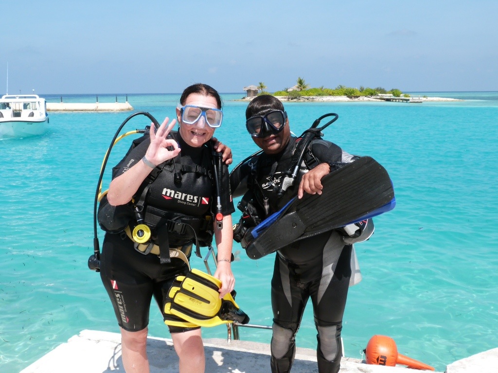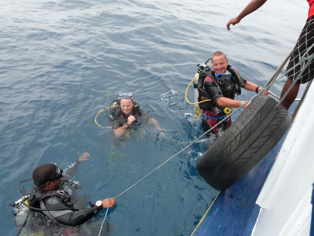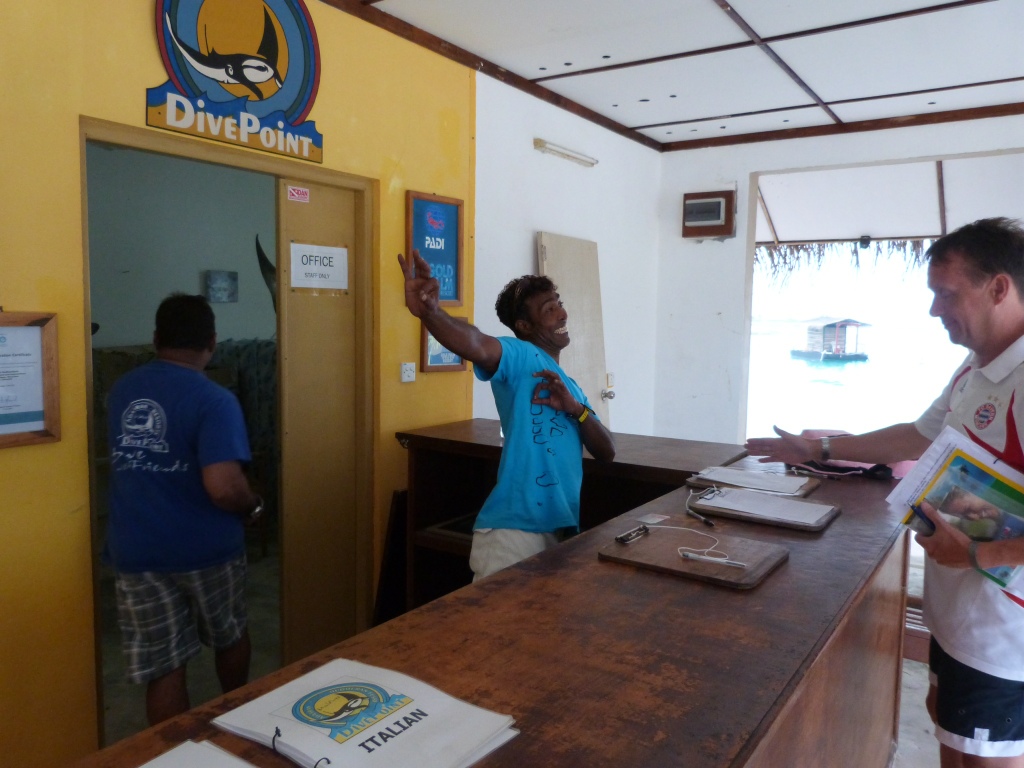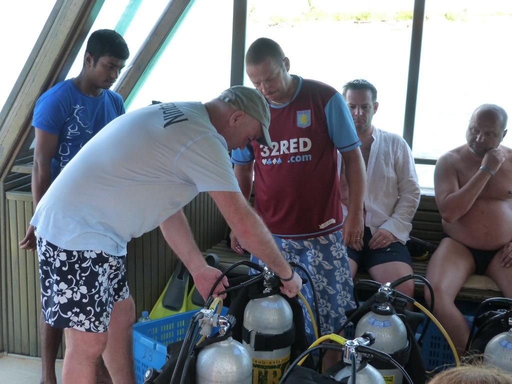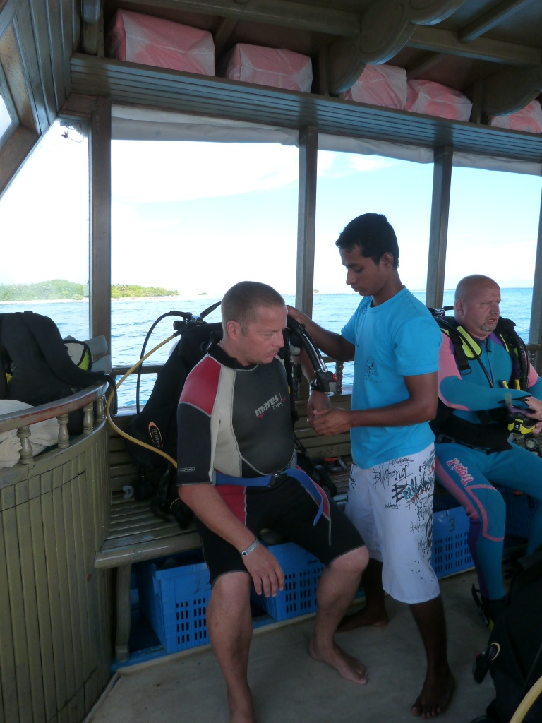 9.00am sees Neil arrive for his first dive (40 mins / 20 mtrs) from a boat which takes him out to Kani Corner. It is also his EANx Dive which he has been recommended to do. This uses enriched air which is more beneficial when diving and, in addition, Neil will do the necessary studying required to get this certification. I join the divers on the boat and watch as they prepare for their dive … Neil does really well but is a little nervous but soon overcomes this when his new friend, a lovely guy called Philip, helps him out in setting up his equipment. He soon looks like a pro as he gets his gear on at the dive site and jumps overboard.